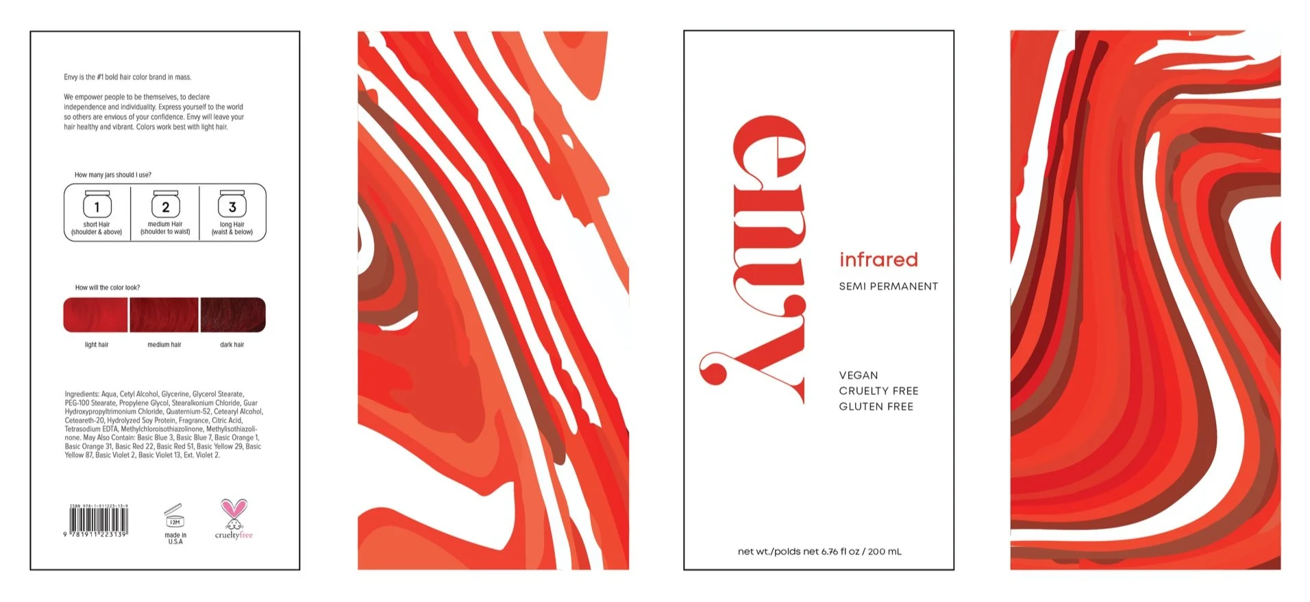 Splat will be renamed and repositioned to be a higher-quality hair dye brand for vivid colors. The brand will start to focus more on the user’s hair integrity while maintaining affordable costs. The designs on the side represent the waves and flow of hair without literal pictures of hair. The concept for the brand will trendy, clean, and aesthetic in order to stand out from competitors on the shelf.